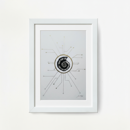 La obra simboliza el amanecer de una nueva era: un sol que no nace del fuego, sino de la conciencia y la tecnología. En su centro, un amonite fósil representa la energía y el poder individual que resurge cuando las personas recuperan el control sobre su destino. Las líneas doradas irradian como circuitos solares, aludiendo a la red descentralizada de Bitcoin, donde la soberanía financiera y la libertad personal se expanden sin fronteras. “El Nuevo Sol” es una metáfora del renacimiento humano frente a un sistema más libre y luminoso.