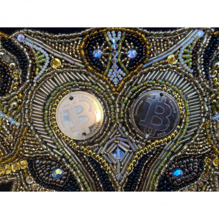 Materials: -fabric -beads Preciosa -threads Tytan 100 for bead embroidery -needles for beadwork -coins «Denarium Bitcoin» -Swarovski stones -Rhinestones-Handmade decorative frame