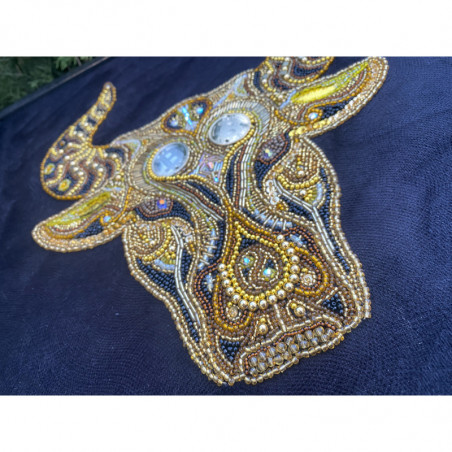Painting BULLCOIN embroidered with physical Bitcoin coins, decorated with beads, rhinestones and Swarovski stones