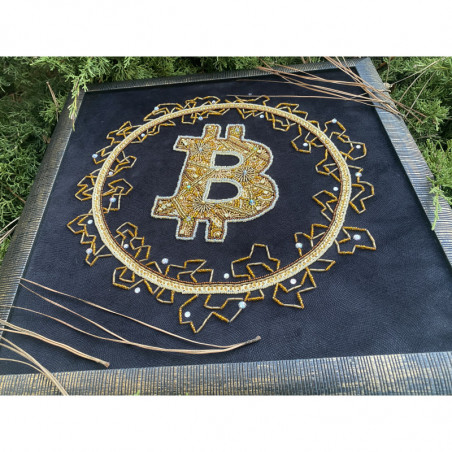Painting Fiery Bitcoin embroidered and decorated with beads, rhinestones and Swarovski stones