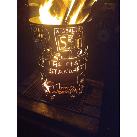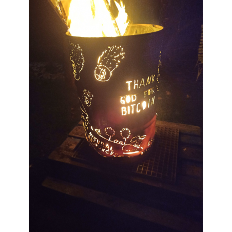 Every Bitcoiner knows this Cartoon, now available as a burn barrel Printer, Markers and scissors, Plasmacutter 56cm wide and 86cm high, fitted with a woodplate and firesimulation light