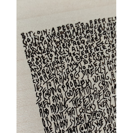 Explore Shamshad's unique artistry with this auction bundle, featuring a laser-engraved wood motif and a signed print, where his text-based technique culminates in the Bitcoin Logo, an intricate fusion of art and the Bitcoin Whitepaper.
