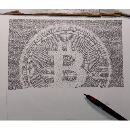 These unique 'pictures' are composed entirely of alphabet letters without any additional pen strokes. The visual effects of light and shadow are artfully created through the expansion and compression of the letters. Over the years since 1986, Shamshad has crafted more than 200 such images. Among these, the Bitcoin Logo stands out as one of his most challenging creations, accomplished at the age of 66. The Bitcoin Whitepaper has been incorporated as text in the artwork.
