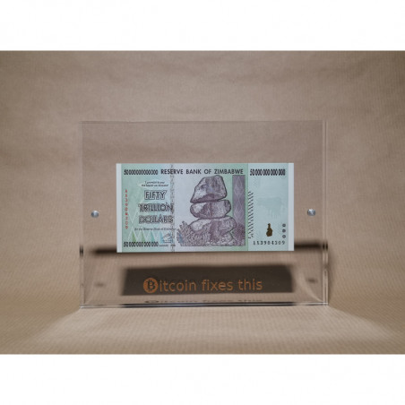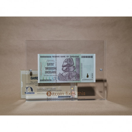 The acrylic frame with original 50T Dollars Zimbabwe bill with certificate.