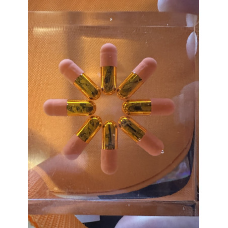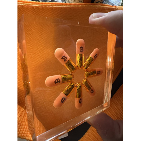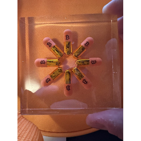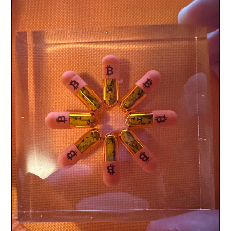 I used a real gelatin size 0 orange pill medical grade and printed a bitcoin logo onto them.