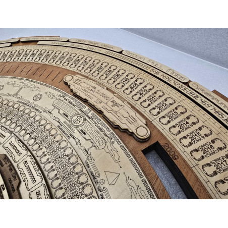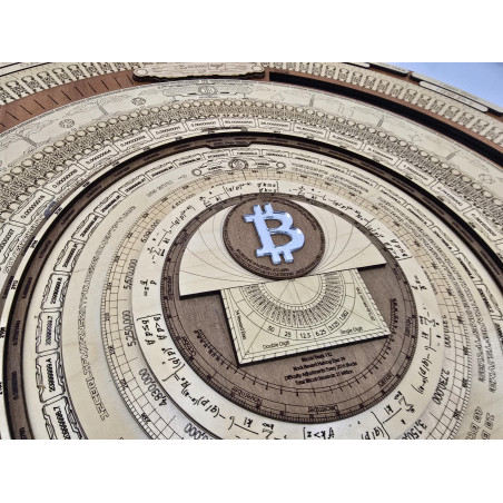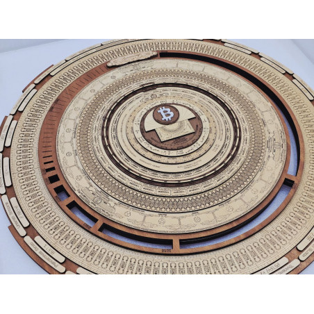 Meticulously assembled from a diverse selection of woods, the work draws strength and contrast from the natural variations of its materials. The layered woods portray the architecture of Bitcoin itself, a system built from code, consensus, and time.