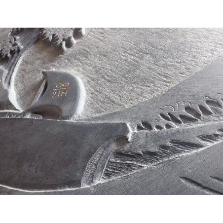 Over the course of three months and using hammer and chisel, I shaped the stone’s surface to echo the layered textures of traditional woodblock printing, where each carved area—rough, smooth, or rippling—creates distinct shades in the slate. These textures evoke a spectrum of colors that shift with the light, much like the vibrant energy of Hokusai’s original print. For the guiding light of the Bitcoin moon, I used 24k gold leaf. The Bitcoin symbol is always present there, but it remains subtle and not easily seen from a distance. Gold leaf also decorates the sail of the Ark as it rides the waves, in a nod to Knut Svanholm's well known Bitcoin meme, "Everything divided by 21 million." Like Bitcoin, this carving is my expression of hope and self-determination in the turbulent sea of fiat-derived instability that surrounds us.