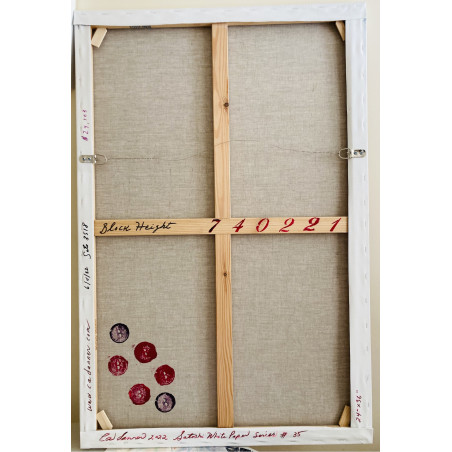 My process is paper glued down and scraped off, string outlines for network effects, and many layers of Acrylic Paint added to Linen Canvas.